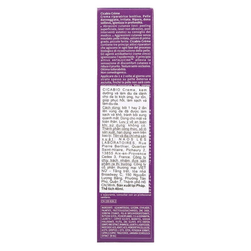 • Hướng dẫn sử dụng: Dùng 2 lần mỗi ngày cho đến khi làn da hồi phục hoàn toàn. Thoa Cicabio Crème lên vùng da tổn thương sau khi đã làm sạch và để khô.